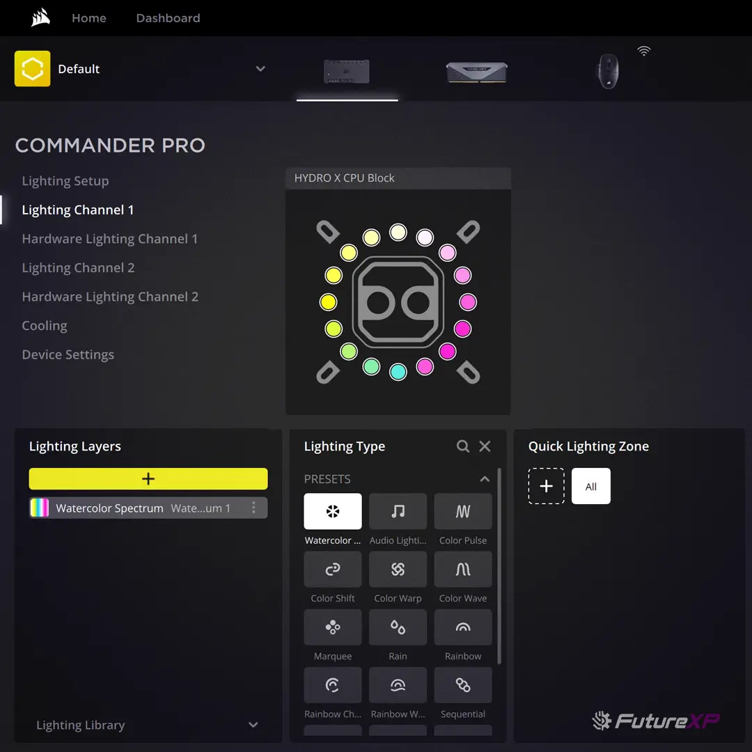 Integra 16 LED RGB direccionables individualmente que se pueden personalizar mediante el software iCUE de Corsair. Con el iCUE podemos sincronizar la iluminación RGB en todos los productos compatibles con iCUE, incluidos bloques de refrigeración, ventiladores, teclados, etc.