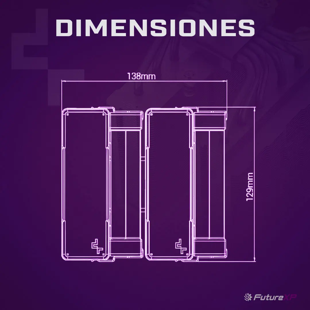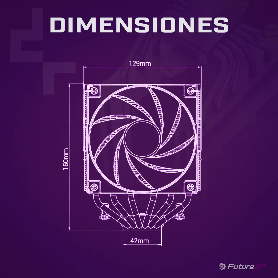 Las dimensiones incluyendo los ventiladores son de 129×138mm con una altura de 160mm y un peso de 1456g. Este peso puede parecer mucho, pero la mayoría se concentra en la base y hay no hace tanta palanca como si el peso estuviera más lejos de la placa base.
