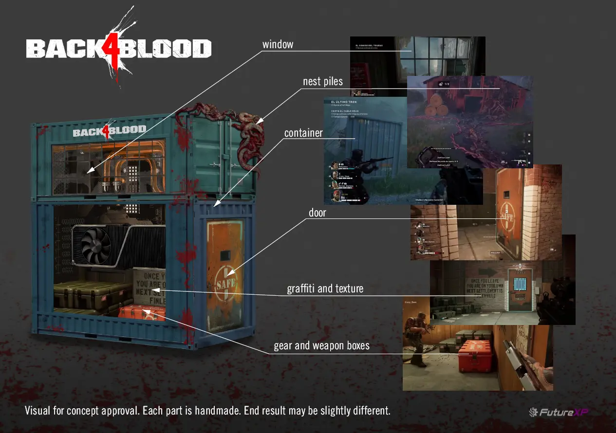 Encontramos inspiración en la mecánica central de Back 4 Blood: los refugios. Para materializar este concepto, se replicó la estética de los contenedores industriales que aparecen constantemente en los escenarios del juego. El diseño final contó con la supervisión de Juan Carlos González (NVIDIA) y Ana Calleja (Warner) para asegurar la fidelidad con la franquicia.