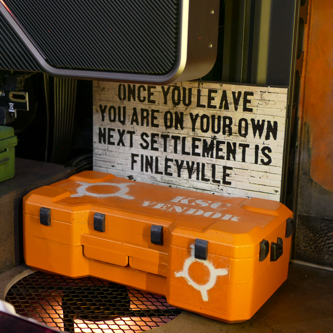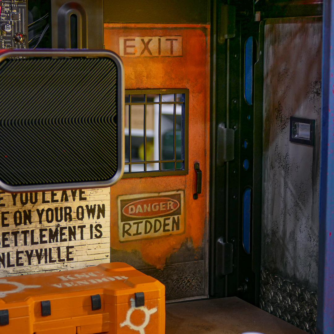 Sobre un chasis genérico, trabajamos con materiales como metacrilato y PVC para darle forma a la estructura. Pintamos la caja a mano y con la ayuda de la artista María Ruiz, logramos la textura y colores exactos. No solo el exterior de este PC imita la estética del videojuego, también hay todo tipo de referencias y detalles en el interior del «refugio». El resultado final es una fusión perfecta de hardware gaming potente y estilo post apocalíptico.